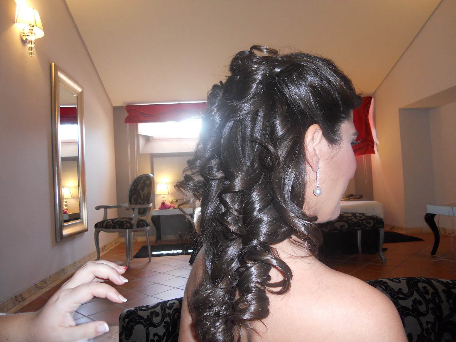 Y por último este recogido con bucles y el pelo suelto.Este tipo de recogido lo realizo muy amenudo pero no pasa de moda nunca y es muy favorecedor.Esta chica tenía muchísima cantidad de cabello y podías hacer también lo que quisieras,pero hay que tener cuidado con los tirabuzones ya que como el cabello sea pesado y con cantidad se pueden caer.Pero por lo que me dijo esta guapisima madrileña le aguanto toda la noche perfectamente.
